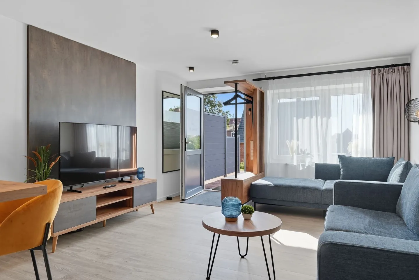 Die geschmackvoll eingerichtete offene Küche und das großzügige Wohnzimmer laden zum Entspannen und Verweilen ein. Auf der Terrasse oder dem Balkon können Sie die frische Nordseeluft genießen und in idyllischer Umgebung entspannen.