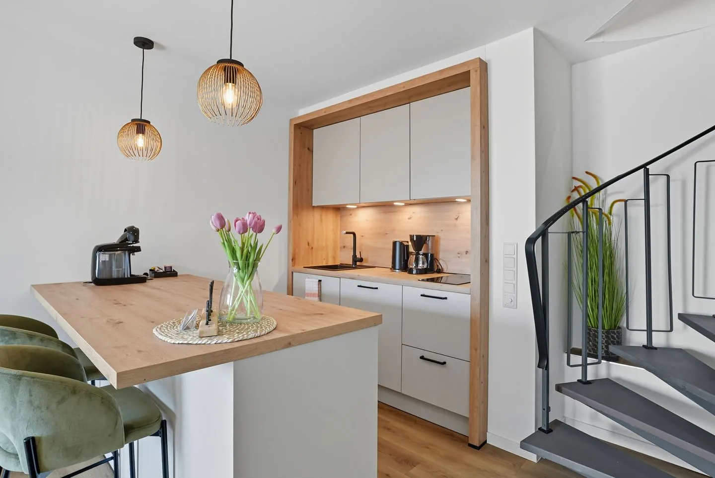Willkommen in unserer exklusiven Ferienwohnung in Carolinensiel! Diese moderne Unterkunft bietet einladenden Komfort für einen Aufenthalt an der Nordseeküste. Genießen Sie die stilvoll eingerichtete offene Küche, das geräumige Wohnzimmer und das komfortable Schlafzimmer mit hochwertigen Möbeln und Designelementen.
